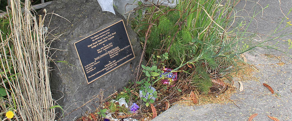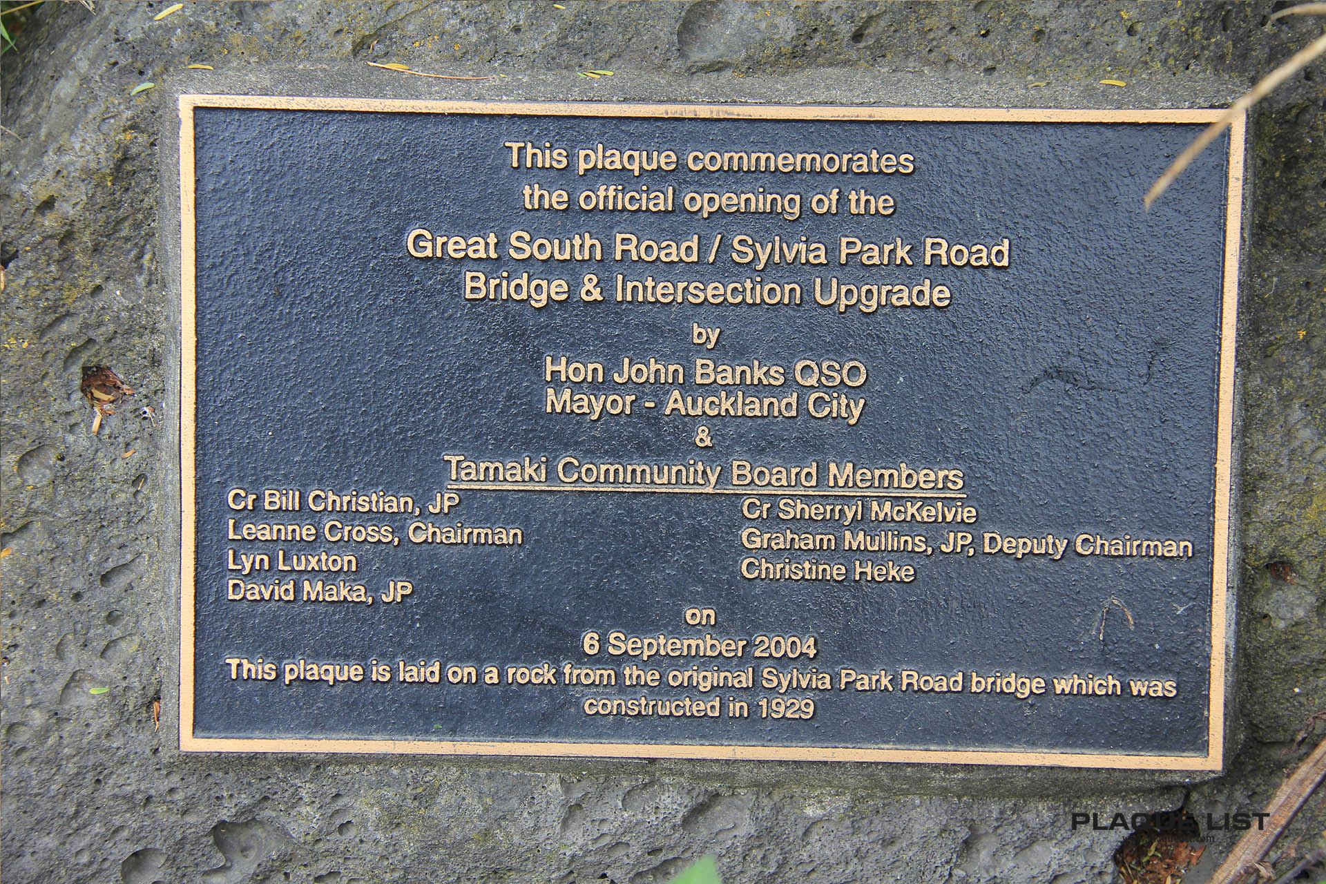 This plaque is laid on a rock from the original Sylvia Park Road bridge which was