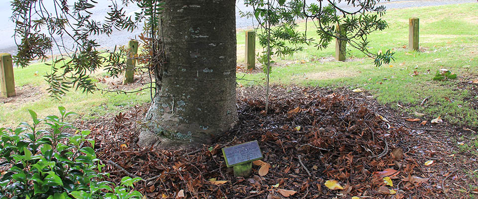 Small plaque amongst the leaves under a tree. Parking on Razorback Rd.