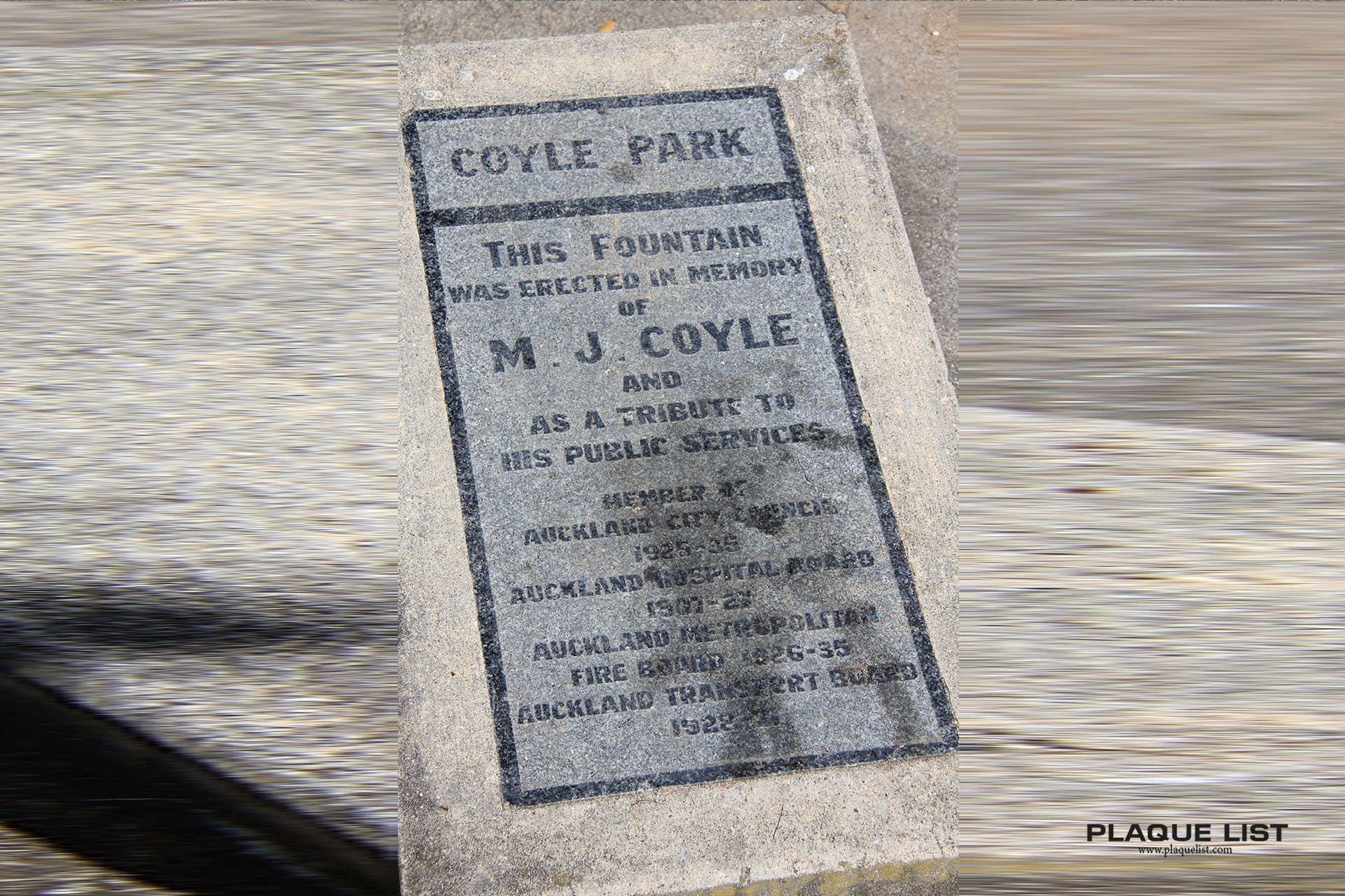 COYLE PARK This Fountain Was Erected in Memory of M J COYLE and As A Tribute To His Public Services Member of Auckland City Council 1907-26 Auckland Metropolitan Fire Board 1926-35 Auckland Transport Board 1928-35