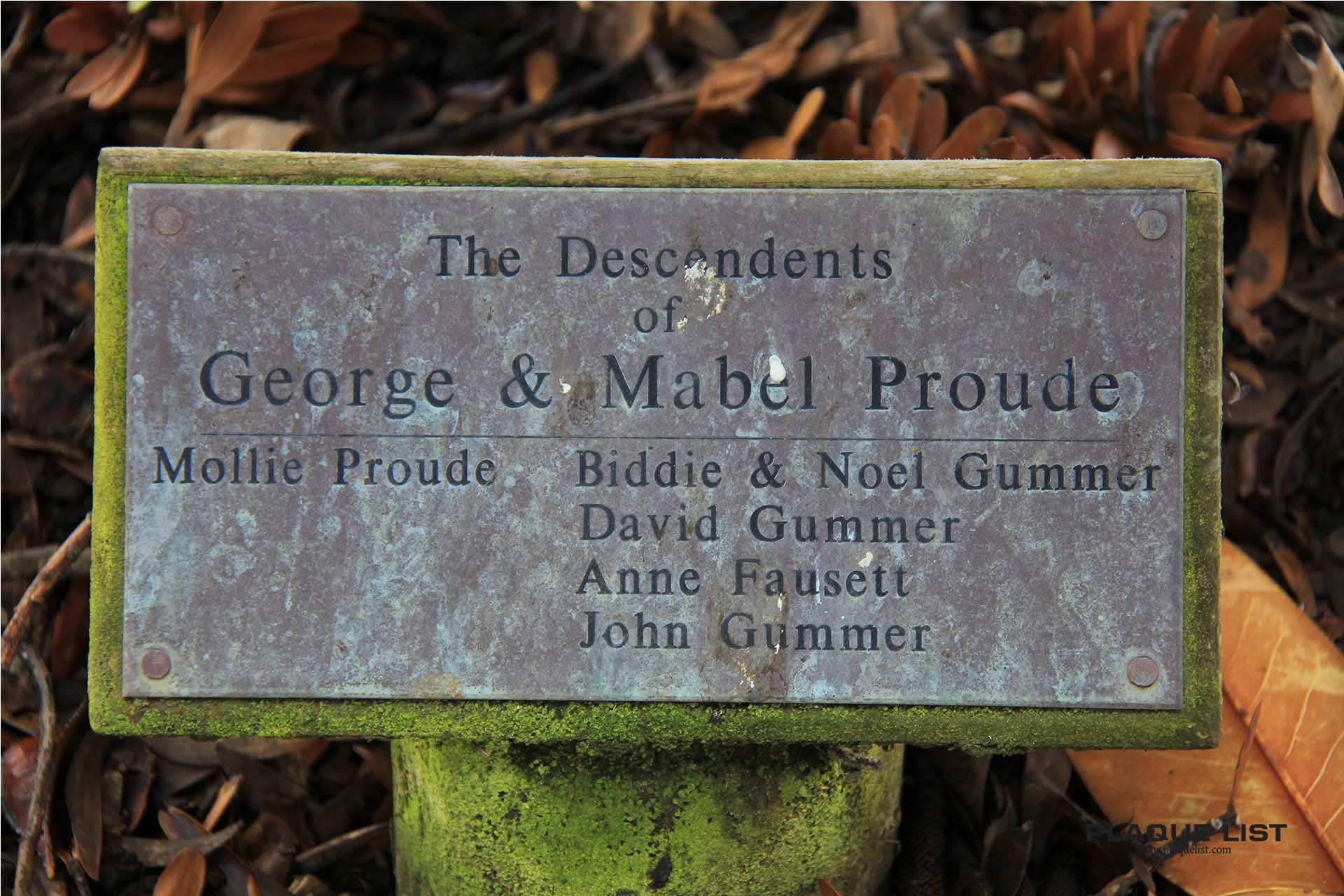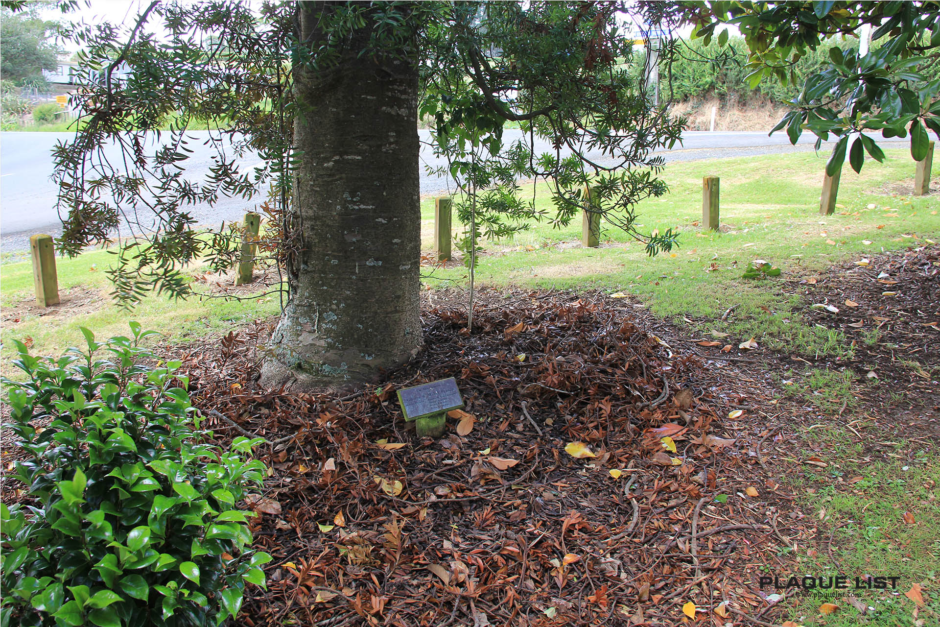 Small plaque amongst the leaves under a tree. Parking on Razorback Rd.
